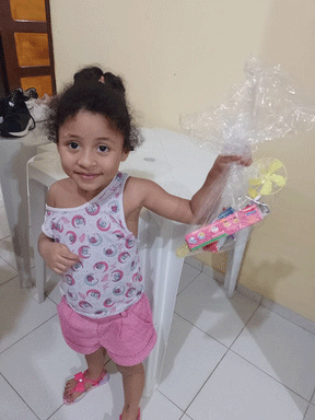 Ritinha tem 6 anos e está participando da sua primeira feirinha. Ela tem aprendido muito sobre Jesus. E diz: "Tia, estou muito feliz! Gosto muito de estar aqui no PG com as crianças".