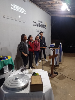 Nossas crianças na Igreja: Murilo, Raynara, Rayane e Riliane. Como eles cresceram de todas as maneiras. Estatura, graça e conhecimento! Fruto do PG do Projeto Lado a Lado no sítio Minguiriba.